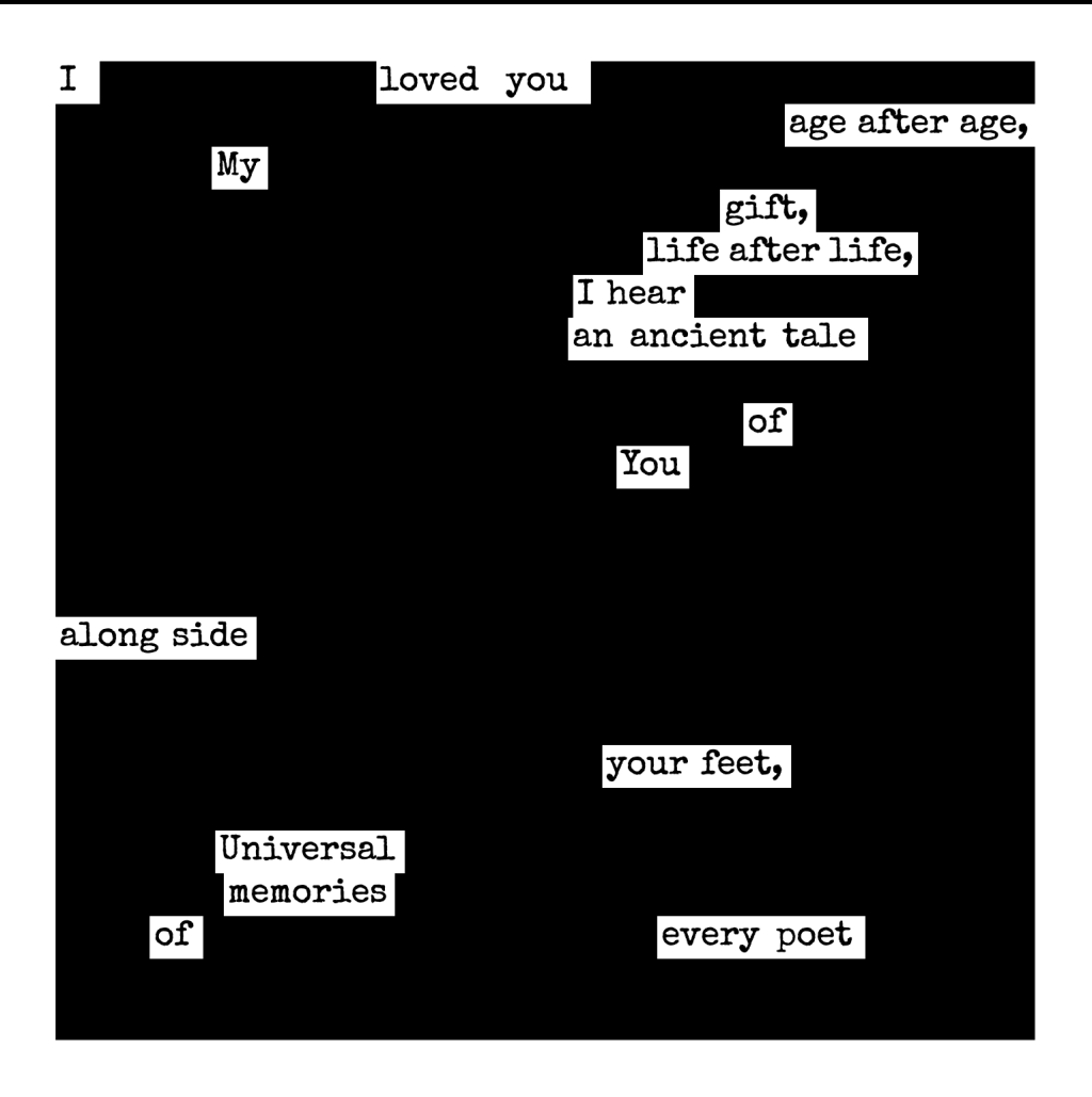 NaPoWriMo Day 11 – And now for today’s (optional) prompt! Erasure poetry — also known as blackout poetry — is written by taking an existing text and erasing or blacking out individual words. Feel free to maintain the whitespace of the original text (as is traditional for erasures/blackouts . . . if anything can be called traditional about them) or to pluck words/phrases from your chosen source material and rearrange them.